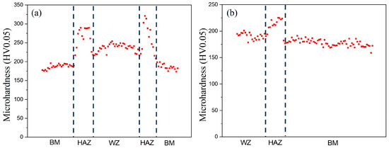 Microhardness of the two weld joints: (a) UNGW and (b) SAW.