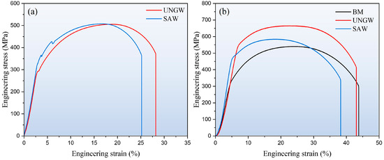 (a) The large-scale tensile engineering stress–strain curves of whole welded joints, and (b) the small-scale tensile engineering stress–strain curves of the WZ.