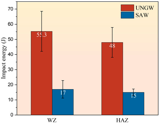 The impact energy of specimens from the WZ and HAZ in UNGW and SAW welded joints at −40 °C.