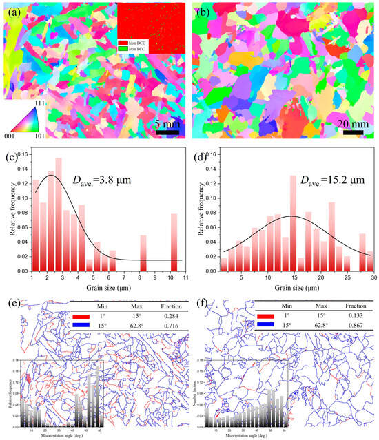 EBSD-IPF map of the WZ: (a) UNGW, and the inset is the relevant phase distribution map; (b) SAW. Grain size statistical graph: (c) UNGW; (d) SAW. Grain boundary distribution, and the inset is the misorientation angle distribution diagram: (e) UNGW, and (f) SAW.