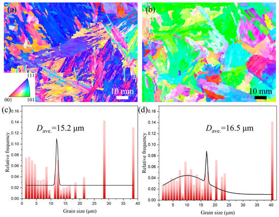 EBSD-IPF map of HAZ: (a) UNGW; (b) SAW, and corresponding grain size statistical graph: (c) UNGW, and (d) SAW.