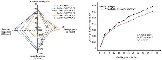 - Prajapati, P.K.; Biswas, P.; Singh, B.K.; Bapanapalle, C.O.; Ghosh, R.; Mandal, N. Reinforcing Potential of MWCNTs on Mechanical and Machining Performance of Hot-Pressed ZTA-MgO Ceramic Cutting Inserts. Diam. Relat. Mater. 2023, 138, 110202. [Google Scholar] [CrossRef]