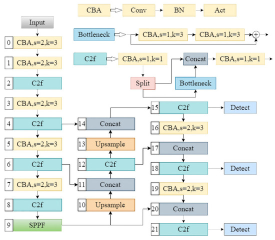 This study is conducted based on the YOLOv8 model [25], and the network structure is illustrated in Figure 3. The activation function is defined after each convolution and regularization step. The other components of the model remain unchanged while the experiments are conducted using various activation functions. In each experiment, we utilized the Ultralytics framework to modify the activation functions employed by the model. For this study, the input casting image size is set to 640 × 640 pixels, which is progressively compressed through several modules. Simultaneously, the number of feature channels increases gradually from 3 channels in the input image to 1024 channels in the deepest layer. Each feature layer contains critical information about the casting, influencing the prediction results. The model includes three detection heads for the feature maps at layers 15, 18, and 21, respectively.