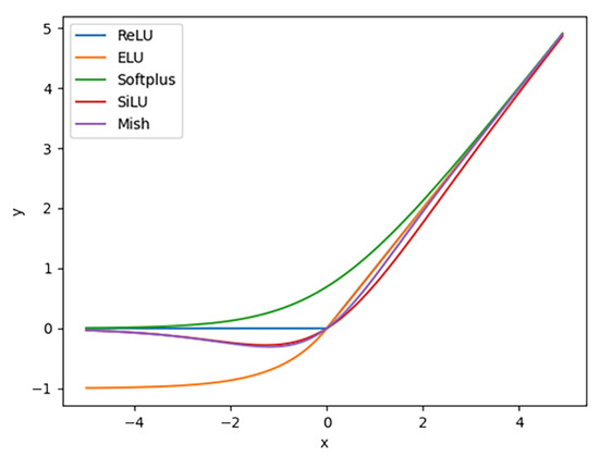 The SiLU function has garnered widespread attention for its excellent performance, inspiring some scholars to propose the Mish function [30]. Its calculation formula is given by Equation (5).