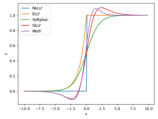 The derivative curves of different activation functions are illustrated in Figure 5. The derivatives of the SiLU and Mish functions exhibit smoother transitions around input 0 compared to those of the ReLU family functions. The gradient of the Softplus function changes more gradually.