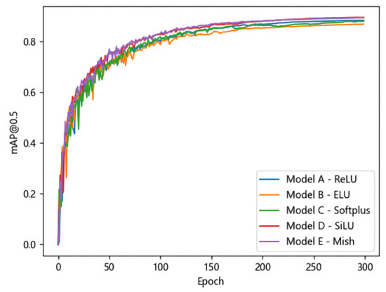 The model was trained for a total of 300 epochs, with the batch size set to 16. The variation in the mAP@0.5 values of the five models on the validation set with respect to the number of training epochs is shown in Figure 6. From Figure 6, it can be observed that the SiLU and Mish functions exhibit similar performances and consistently outperform the other activation functions throughout the training process. Additionally, their curves reach a steady state earlier, meaning that the mAP@0.5 values stabilize more rapidly as the number of training epochs increases. The ReLU and Softplus functions perform similarly but achieve lower mAP@0.5 values compared to SiLU and Mish. Despite introducing a gradient for negative inputs, the ELU function remains less accurate than the ReLU function in detection tasks. The experimental results demonstrate that the SiLU and Mish functions possess superior fitting capabilities for casting defect detection and are thus more suitable for this application. The computational complexity of the Mish activation function is higher than that of the SiLU activation function, yet its performance in detecting casting defects is superior. When the device has sufficient computing power, employing the Mish activation function can yield better results.