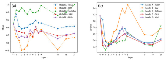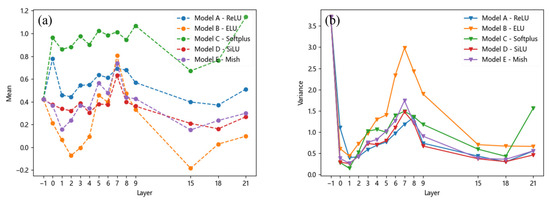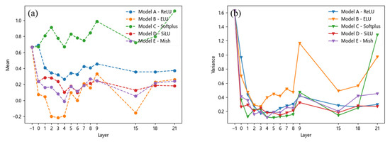 As shown in Table 1, different activation functions led to varying model accuracies on both the validation and test sets. Given that the architecture of the five models is identical, the differences in accuracy are primarily attributed to the weights of each feature layer. However, neural network weights are typically high-dimensional arrays that lack intuitive interpretability when viewed directly. The forward computation in the feature layers transforms the input casting image information by recalculating the feature maps through the weights, gradually extracting casting defect features to achieve accurate defect recognition. Therefore, this study conducted statistical analysis on the mean and variance of different feature layers to compare and analyze the impact of the five models on accuracy.