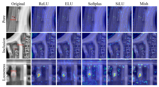 Although the Mish activation function exhibits the highest casting defect detection performance in this study, Figure 10 shows that the model also pays some attention to background regions with grayscale variations. This suggests that the model struggles to effectively discriminate between background and casting defects, leading to potential false detections when the contrast of casting defects is low. Future work could explore specific modules to reduce the model’s focus on non-defective regions with grayscale variations.