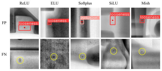 To gain a more intuitive understanding of the impact of defect confusion with the background, Figure 11 presents examples of false positives (FPs) and false negatives (FNs) under five activation functions. In the figure, FP refers to cases where the model incorrectly classifies the background as a defect target, while FN refers to cases where the model misclassifies a defect target as the background. Both types of errors are highlighted with yellow circles. For FPs, due to the relatively small gray-level variation in loose defects, the model is more likely to confuse loose defects with the background. For FNs, the model tends to miss detections, particularly for small-sized pores or inclusions.