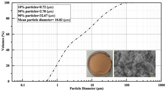 The cement utilized was P.O 42.5 ordinary Portland cement procured from Hailuo Company (Wuhu, Anhui, China), with its primary chemical compositions and physical properties systematically documented in Table 1. The recycled clay brick powder (RCBP) was derived from recycled clay brick sand supplied by a local building material company, following the following preparation protocol: initial rinsing with tap water to remove impurities, subsequent drying in an oven at 105 °C for 48 h, and fine grinding using a Retsch PM400 planetary ball mill (provided by Verder (Shanghai, China) Instruments and Equipment Co., Ltd., Shanghai, China) at 400 revolutions per minute for 1 h. The ground material was then sieved through a 45 μm mesh to ensure 100% particle size distribution below 45 μm, followed by re-drying at 105 °C for 48 h prior to sealed storage. Figure 1 presents the visual characterization of RCBP, the particle size distribution, and the microstructural morphology, while the specific surface is determined as 0.895 m2/g.