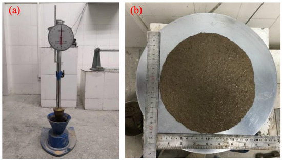 The mortar fluidity was evaluated per the GB/T2419, employing a specialized fluidity tester as shown in Figure 3b. The experimental procedure commenced with the thorough cleaning and moistening of the test mold, compaction rod, and table surface using damp cloths, followed by coverage with additional damp cloths to maintain optimal humidity conditions. The uniformly mixed mortar was then loaded into the mold in two distinct stages. The initial fill reached approximately two-thirds of the mold’s height and was subsequently compacted by manually tamping the mortar from the periphery towards the center 15 times. In the second stage, the mortar was filled to a level 20 mm above the mold’s brim and similarly compacted with 10 tamping motions. Upon removal of the mold casing, excess mortar was carefully leveled off and the truncated conical mold was detached. The table was then activated to execute 25 controlled jumps, facilitating the mortar’s fluidic movement. Post-jump, the fluidity was quantitatively assessed by measuring the diameter of the mortar spread along two perpendicular axes using a calibrated ruler. The final fluidity value was determined as the arithmetic mean of these three measurements, ensuring compliance with standardized testing protocols and enhancing the precision of the experimental outcome.