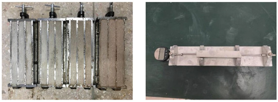 The initial length (l0) of each specimen was measured using an alkali–aggregate reaction comparator (right subgraph of Figure 5) with a precision of 0.001 mm. To minimize temperature-induced measurement errors, each specimen was removed from the oven, swiftly wiped with lint-free paper, and measured within 15 s. The measurement orientation and position were strictly maintained for all specimens. Subsequently, a 1 mol/L NaOH solution was prepared using analytical-grade NaOH and deionized water. The specimens, after initial length recording, were immersed in this solution within the polypropylene containers, ensuring complete submersion. The sealed containers were returned to the 80 ± 2 °C oven for continued curing. Length measurements were repeated at 3, 7, 10, and 14 days following the same protocol. The expansion rate for each specimen was calculated as the average of three replicate measurements using the following Equation (7):
