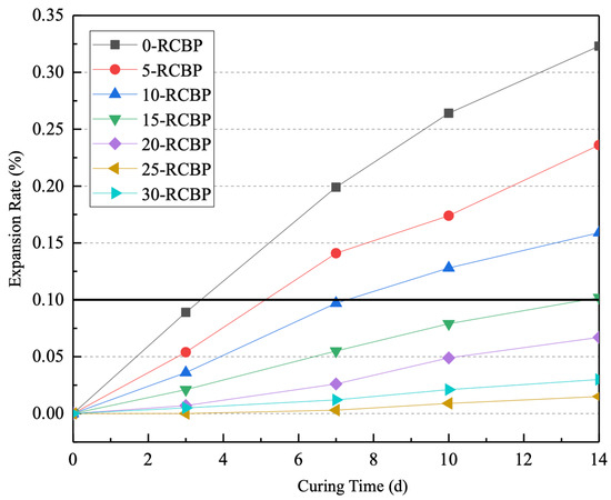 Figure 8 illustrates the influence of recycled clay brick powder substitution rates on alkali–silica reaction expansion kinetics across curing periods. The experimental data exhibit a coherent dosage–response pattern: specimens with 0–25% RCBP replacement demonstrate progressive ASR suppression as evidenced by monotonically decreasing expansion rates. Notably, 20% and 25% substitution groups achieved 14 day expansions (ε14) of 0.067% and 0.015%, respectively—both substantially below the 0.10% safety threshold specified in GB/T 14684. The 30% RCBP group maintained compliance (ε14 < 0.10%), confirming that ≥20% substitution effectively mitigates glass-induced ASR. Quantitative analysis reveals remarkable reduction efficacies of 79.26%, 95.36%, and 90.71% expansion decreases at 20%, 25%, and 30% substitutions relative to the control (0-RCBP). The existence of an optimal substitution level (25% RCBP) mirrors findings by Du et al. [42] regarding supplementary cementitious materials (SCMs) in ASR mitigation. Their comparative study established nonlinear relationships between SCM dosage and expansion suppression, identifying 5% silica fume and 20% fly ash as respective optima. This phenomenon arises from competing mechanisms. On the one hand, alkali-binding dominance below 25% RCBP is because the aluminosilicate phases sequester free Na⁺/K⁺ ions; whilst on the other hand, cement dilution effects beyond 25% are because reduced Ca(OH)2 availability limits pozzolanic reactions. The observed peak performance at 25% RCBP suggests an equilibrium between these counteractive processes, providing critical guidance for balancing ASR inhibition with mechanical performance retention in glass–aggregate mortars. This dosage optimization principle proves particularly crucial for applications where both durability and structural integrity are paramount.