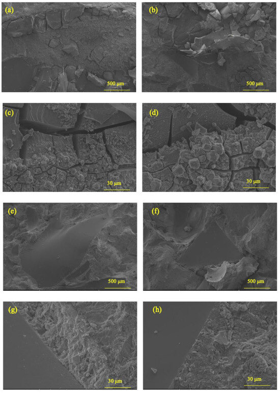 Figure 9 presents a comparative analysis of crack patterns observed in accelerated alkali–silica reaction mortar specimens after 14 days of curing. Specimens with 0%, 5%, and 10% RCBP substitution (denoted as 0-RCBP, 5-RCBP, and 10-RCBP) exhibited pronounced surface deformations accompanied by wide, interconnected cracks. In contrast, specimens containing 20%, 25%, and 30% RCBP (20-RCBP, 25-RCBP, and 30-RCBP) maintained dimensional stability with no visible deformations, although fine microcracks were detectable upon close inspection. These observations suggest a threshold RCBP content between 10% and 20% where microstructural integrity is significantly enhanced against ASR-induced damage. Microscopic examination of 0-RCBP specimens using scanning electron microscopy (Figure 10a–d) revealed severe fragmentation of recycled glass sand particles, forming disordered networks of microcracks at 200× magnification. Higher magnification (1600×, 3000×) highlighted secondary cracking within cement paste and poor interfacial bonding between glass sand and hydration products. Crystalline precipitates were observed on fractured glass surfaces, indicative of ongoing ASRs. Conversely, SEM analysis of 25-RCBP specimens (Figure 10e–h) demonstrated intact glass sand particles and dense cementitious matrix at 100× and 200× magnifications. At 3000×, both glass sand and binder phases exhibited crack-free surfaces with well-integrated interfacial zones, confirming effective mitigation of ASR by optimal RCBP incorporation.
