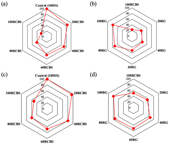 Consistency and fluidity relative to the control (sample mortar with 100% standard sand) (%): (a,b) consistency; (c,d) fluidity. Note: for (a,c) the numerical value indicates the substitution percentage of recycled clay brick sands relative to the control group, which is fabricated using 100% standard sands. For (b,d) the numerical value represents the substitution percentage of recycled glass sands in comparison to the mortar specimen composed entirely of recycled clay brick sands.