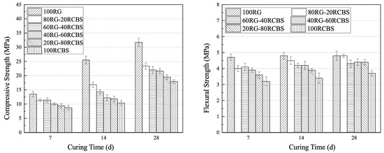 Figure 14 visually presents the compressive and flexural strengths of RG-RCBS mortar with varying substitution ratios of clay brick sand at 7, 14, and 28 days. The compressive strength of RG-RCBS mortar with different substitution ratios demonstrates a clear increasing trend with age. Notably, the 100RG mortar exhibits the most significant growth rate among all RG-RCBS mortars, rising from 13.5 MPa at 7 days to 31.7 MPa at 28 days, representing a relative increase of 134.8%. As the substitution ratio of clay brick sand increases, the compressive strength of RG-RCBS mortar at all three ages decreases. The 100RG mortar demonstrates the highest compressive strength at all curing times, with values of 13.5 MPa, 25.5 MPa, and 31.7 MPa at 7, 14, and 28 days, respectively. Conversely, the 100RCBS mortar shows the lowest compressive strength at all equivalent curing times, with values of 8.7 MPa, 10.4 MPa, and 17.9 MPa at 7, 14, and 28 days, respectively.