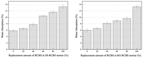 Water absorption of mortar with various proportions: SS-RCBS group (left); RG-RCBS group (right).