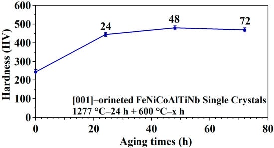 Hardness of [001]-oriented FeNiCoAlTiNb single crystals with different aging treatment durations.