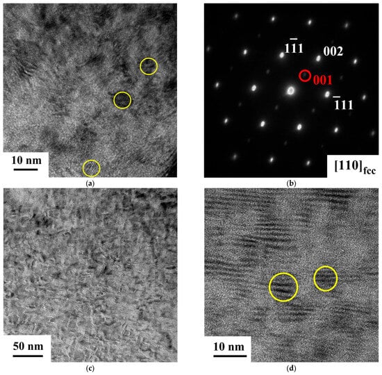 TEM observations were performed to reveal the precipitate morphology of the aged samples (SXL600—24 h, SXL600—48 h, and SXL600—72 h). Figure 2a presents the room temperature BF image of [001]-oriented FeNiCoAlTiNb SXL600—24 h. The yellow circle indicates the precipitate’s diameter. The average diameter of precipitates is 4~5 nm. The SAED pattern is taken from a 100-pole or [011]-zone axis. The results show that the austenitic matrix has an fcc structure, and the precipitate is an ordered L12 structure, as shown in Figure 2b. Figure 2c shows the BF image for SXL600—48 h. The BF TEM image illustrates the precipitate distribution and shows a large number of precipitates. Figure 2d shows an HRTEM image and the precipitate with a size range from 8 to 9 nm. Figure 2e shows the DF TEM image of SXL600—72 h and reveals high precipitate density. The BF TEM image of SXL600—72 h shows that the average precipitate size is approximately 10~12 nm, as shown in Figure 2f. The precipitate size increases its diameter as the aging time increases. From Lauhoff et al. [29]’s TEM results, the precipitate size of FeNiCoAlTiNb aged at 650 °C for 6 h was reportedly around 6 nm. EDS line scans (dashed line) crossing precipitates were performed to evaluate changes in composition between the austenite matrix and precipitates, particularly the precipitates with high Ni content and Fe depletion. The observed L12 precipitate with high Ni content in this study is similar to the FeNiCoAlTi results. Figure 2g shows an HRTEM of SXL600—72 h for composition analysis of precipitates and EDS line scans. In the figure, the dashed line represents the line analysis between the precipitate and the matrix. The line scan result is shown in Figure 2h. Because there are no significant differences between other elements (Co, Al, Ti, and Nb) in the region of the matrix and precipitate, the line scan result only shows the counts of Fe and Ni elements and excludes other elements. The line scan results show decreased Fe and increased Ni in the precipitate position. The composition analysis of precipitates is shown in Table 1. The result shows that the L12 precipitate has a high Ni content. Similar results were reported by Cassinerio et al. [30]. Based on the FeNiCoAlTi, FeNiCoAlTa and FeNiCoAlTaB results, the precipitates contain high Ni and low Fe contents [13,30,31].