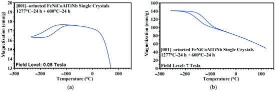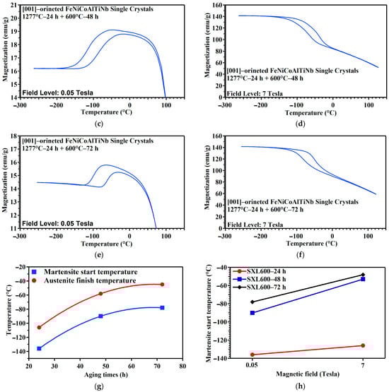 Figure 3a–f show the thermo-magnetic M−T curve measured during the heating and cooling process under an external magnetic field of 0.05 and 7 T for the SXL600—24 h, SXL600—48 h, and SXL600—72 h across a temperature range of 120 °C to 260 °C. Based on this measurement, the martensitic transformation temperatures, i.e., the Af and Ms values, determined using the tangent line method were 106 °C and 136 °C for SXL600—24 h, 56 °C and 88 °C for SXL600—48 h, and −45 °C and −78 °C for SXL600—72 h. The transformation temperatures (Af and Ms) values and temperature hysteresis of [001]-oriented FeNiCoAlTiNb single crystals under different aging condition are presented in Table 2. Figure 3g summarizes the transformation temperatures (Af and Ms) in three different aging conditions. The results show that transformation temperatures increase as aging time increases (24 to 72 h). From 48 to 72 h, the transformation temperatures reach saturated values. Increasing the transformation temperatures with increasing aging times is related to the composition change in the matrix. From the above EDS and line EDS scan results, the precipitates are high in Ni content, depleting Ni in the surrounding matrix. In several reference results, when the Ni content decreases in the austenitic matrix, the transformation temperature increases its value. Figure 3h summarizes the relationship between the transformation temperatures (Ms) and the magnetic field. At a high magnetic field (7 Tesla), the Ms increases its value for all SXL600—24 h, SXL600—48 h, and SXL600—72 h. The result shows that the magnetic fields can induce the martensitic transformation temperatures for this material. The same trend can be found in the [001]-oriented FeNiCoAlTa single crystals [14].
