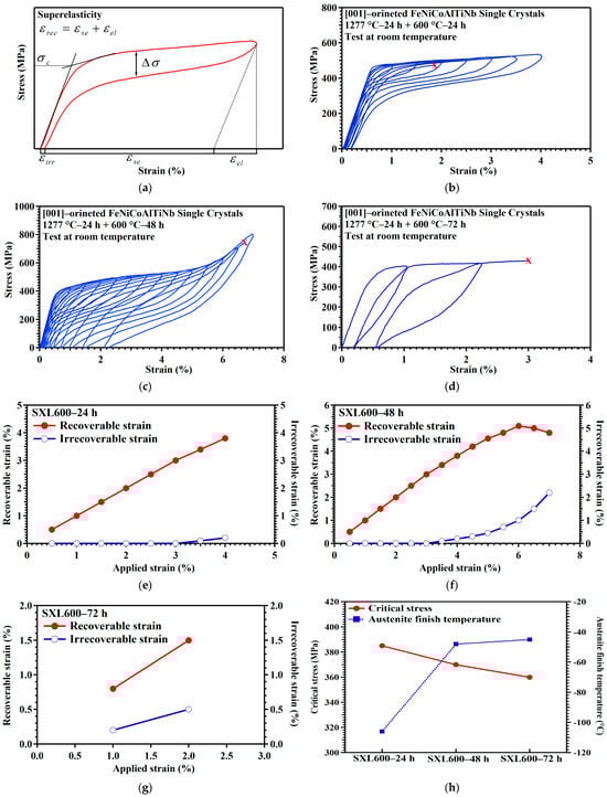 SE responses for [001]-oriented FeNiCoAlTiNb single crystals subjected to various aging heat treatments. (a) Illustration of the superelastic properties such as εrec, εirr, and σc. Superelastic stress–strain curves for (b) SXL600—24 h, (c) SXL600—48 h, and (d) SXL600—72 h. X: point of failure. Summary of the recoverable and irrecoverable strain at various applied strain levels for (e) SXL600—24 h, (f) SXL600—48 h, and (g) SXL600—72 h. (h) Critical stress and austenite finish temperature for three aging conditions.