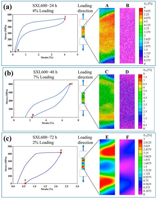The strain fields of the [001]-oriented FeNiCoAlTiNb single crystals subjected to various aging heat treatments analyzed with the DIC method during the superelasticity test. (a) SXL600—24 h during the 4% loading, (b) SXL600—48 h during the 7% loading, and (c) SXL600—72 h during the 2% loading.