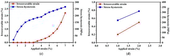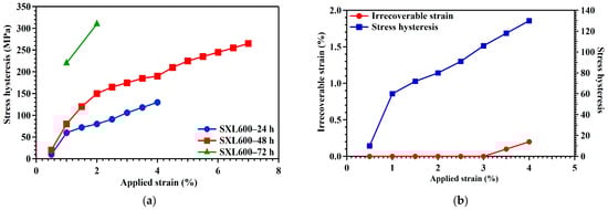 (a) Stress hysteresis as a function of applied strain in three different aging conditions. The irrecoverable stain and stress hysteresis of the applied strain for (b) SXL600—24 h, (c) SXL600—48 h, and (d) SXL600—72 h. Data points were extracted from the superelastic results, as shown in Figure 4.