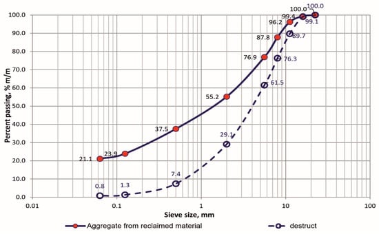 Reclaimed asphalt marked as RAP was obtained by milling the surface of a municipal road in the vicinity of Warsaw. The grading of the RAP and the mineral mixture after extraction was determined in accordance with the assumptions of the PN-EN 12697-2:2019-08 standard []. The results of the grading of the reclaimed material and the mineral mixture from RAP are presented in Figure 1. The recovery of the mineral mixture and the determination of the soluble binder content in the reclaimed asphalt were carried out using the mass difference method in an automatic extractor according to PN-EN 12697-1:2020-08 []. The soluble asphalt content in RAP is 5.6%. No tar binder was found in the tested specimen. The petrographic evaluation of the mineral mixture obtained from the reclaimed material showed that it contains aggregates from rocks such as basalt, melaphyre, granite, and greywacke.