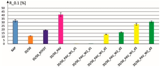 Figure 11 and Figure 12 present the results obtained for two doses of activators W1 and W2 (d0 and d1). It can be seen that in the case of dosing level d1 the consistency of the obtained mixture is almost liquid, which means significant compliance to permanent deformations and a minimum value of the so-called elastic recovery. In the case of dosing level d0 of the W1 and W2 additives, it was possible to maintain almost the same values of elastic recovery parameters as for the binder extracted from RAP, while significantly increasing the compliance to permanent deformation.