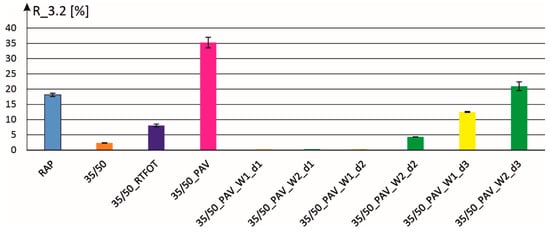 In the case of the parameter R_3.2 (Figure 3), zero values of elastic recovery for the additive dosage d1 are also obtained. Moreover, in the case of the additive W1, with the dosage d2 no elastic recovery is achieved. Non-zero values of the parameter R_3.2 were obtained only for the smallest mass content of the additive, i.e., d3, for both additives and for the dosage d2 for the additive W2. The parameter of elastic recovery at a high-stress level R_3.2 is usually used to assess modified and highly modified binders. In the case under consideration, paving grade bitumen is involved, rendering the MSCR test significance lower in the assessment of rheological properties.