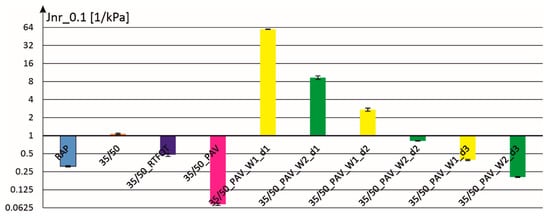 The following Figure 4 and Figure 5 show the parameters of compliance to permanent deformations at the load levels of 0.1 and 3.2 [kPa]. In both cases, the compliance value for binder–additive mixtures with dosing level d1 was so high that, for better readability of the figures, the scale on the ordinate axis was changed to a logarithmic one (with base equal to 2).