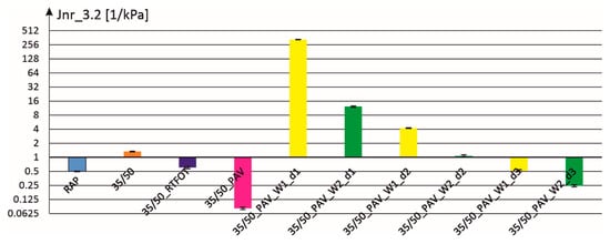 For the study, 35/50 unmodified binder was selected, which was successively aged by RTFOT and PAV [,], and then additives were added to the binder. The MSCR tests according to ASTM D7405 [,] were performed to assess the rheological properties the composed binders [,,,] carried. This test consists of repeated loading and unloading of a sheared sample with a stress pulse with a maximum shear stress value of 0.1 kPa and then 3.2 kPa [,] at a temperature of 60 [°C]. Based on the conducted tests, the parameters R_0.1kPa and R_3.2kPa are determined, which represent elastic shearing recovery and are expressed in %. Obtaining a high value of shearing recovery means that the material is more elastic than plastic (in the case of the value equal to 100%, the material is fully elastic, while in the case of a low percentage recovery, it is becoming more plastic, which translates into substantial permanent deformation in the pavement). Additionally, it indicates so-called compliance to irreversible creep deformation Jnr_0.1kPa and Jnr_3.2kPa (the higher the compliance, the greater the sensitivity to permanent deformation, which consequently translates into rutting of the mineral–asphalt mixture). Summarizing, obtaining a high value of recovery and a low value of compliance is the goal of this analysis. The MSCR test is a test that is intended to allow for a rational assessment of polymer-binders or other binders when subjected to various types of modifications.