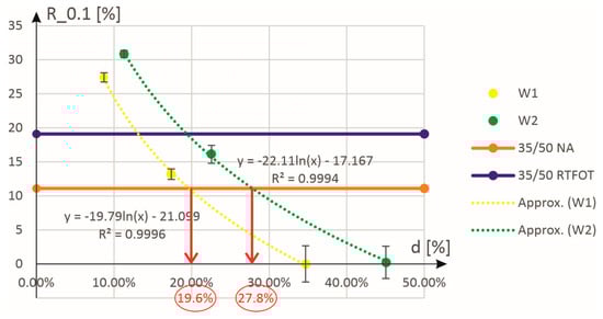 In the case of the parameter R_0.1, the elastic recovery as a function of the additive dosage (W1 and W2, see Figure 6) was plotted on the graph. These are the filled circular markers visible on the graph, through which approximations were then performed with functions of the following form: