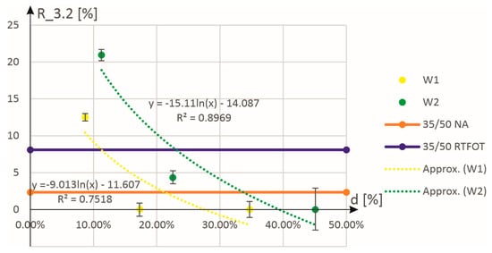 where d is the activator dosage (in%) while a and b are parameters determined in regression analysis. As part of the approximation, the parameters a and b were determined to minimize the mean square error. As shown in Figure 6, the proposed function ideally fits the experimental results, as evidenced by the determination coefficients at the level of 0.99. Additionally, in this figure, the horizontal lines determine the value of elastic recovery at a low level of stress excitation obtained for the original 35/50 binder (not subjected to aging and RTFOT-aged). Therefore, the intersection points of the approximation functions and the horizontal lines determine the dosage that allows obtaining elastic recovery for the unaged or RTFOT-aged asphalt binders. For example, Figure 6 illustrates (red arrows) how to determine the dosage that achieves an elastic recovery R_0.1 equivalent to that of the unaged 35/50 binder. The results highlighted in red font can be found in the sixth column of Table 3.
