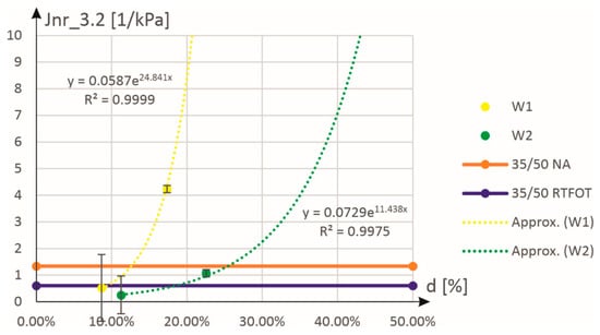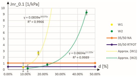 Table 4 presents the parameters of the approximation of experimental results using Equations (1) and (2). The coefficients of determination for these approximations, ranging from 0.75 to 0.99, are shown in Figure 6, Figure 7, Figure 8 and Figure 9. For further analyses, the mass share values were considered reliable when determined based on the equivalence of compliance to permanent deformations (Jnr_0.1) with the results obtained for the binder after technological aging. These values are highlighted in gray cells in Table 3 and Table 4.