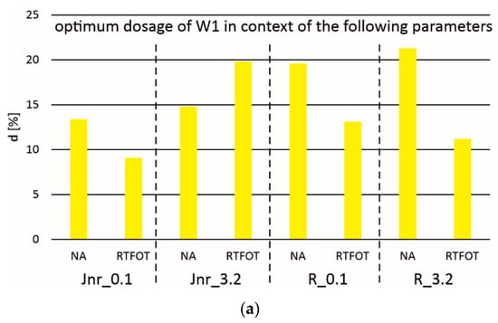 - For each of the analyzed additives (i.e., W1 and W2) there is an optimal mass content in relation to the binder, which allows for obtaining the best values of basic features (penetration, Fraass breaking point, etc.) and rheological properties determined in the MSCR test;