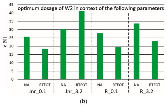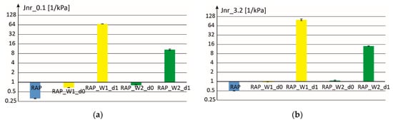 Parameters of compliance to permanent deformations: (a) Jnr_0.1 and (b) Jnr_3.2, for mixtures with two additives (W1 and W2) and with two volume fractions d0 (optimal value) and d1.