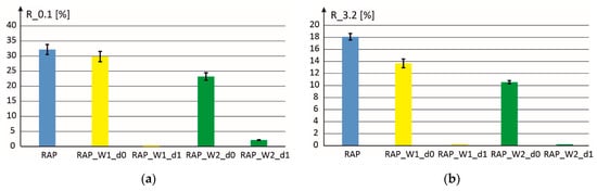 After determining the optimal content of chemical activators W1 and W2 in Section 3.2, here the effect of activators on binders recovered from RAP is analyzed. The results of basic tests carried out on this binder are presented in Table 5, which were the basis for assessing the effectiveness of the used additives W1 and W2. Asphalt mixtures with additives were prepared using the so-called optimal dosage d0 (see Section 3.2).