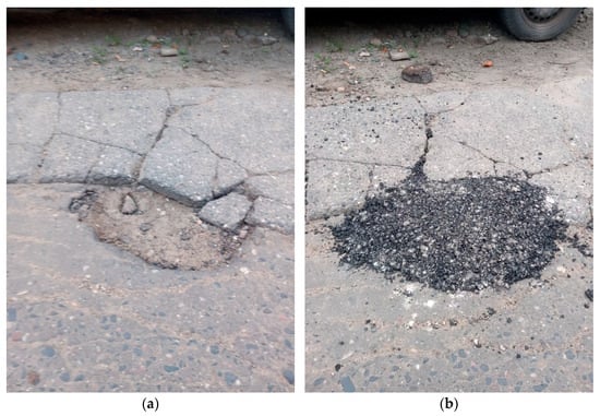 The exemplary application of the mixture based on activator W2: (a) before repair, (b) just after filling the pothole.