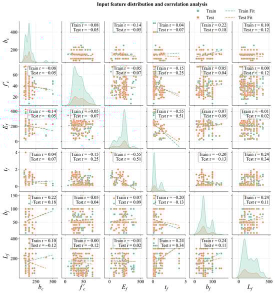 To develop the predictive model, this study selects material properties (fc′ and Ef) and geometric parameters (tf, bf, Lf, and bc) as input features, and Pu serves as the target variable. The statistical characteristics of these parameters, including the minimum, maximum, mean, and quartiles (Q1, Q3, etc.), are summarized in Table 2. The dataset is randomly divided into 80% for training and 20% for testing. Figure 1 illustrates the sample distributions in the training and test sets, as well as the correlation analysis of the input features. The results indicate that the training and test sets exhibit a similar distribution in the feature space, and no significant multicollinearity is detected among the input features.