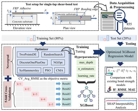 In recent years, fueled by the growth of big data and advances in machine learning, new approaches have been developed to address complex nonlinear problems. Recent studies have established diverse predictive models for the FRP–concrete interfacial bond strength using extensive experimental datasets [,,,,,,,]. For instance, Zhou et al. [] employed a backpropagation neural network (BPNN) to develop an explicit prediction model that outperforms most traditional models in terms of accuracy. Su et al. [] compared three machine learning methods and found that the support vector machine (SVM) exhibited the best performance, with prediction accuracy further enhanced by a stacking ensemble. Zhang et al. [] systematically evaluated six machine learning models based on a single-lap shear test database, and the results showed that the extreme gradient boosting (XGBoost) achieved a 54% reduction in coefficient of variation compared to optimal traditional models. These studies demonstrate that machine learning methods can substantially improve the accuracy of FRP-concrete interfacial bond strength predictions. However, the generalization ability and stability of these models still require improvement, and the selection of model hyperparameters significantly impacts the final prediction accuracy. Consequently, developing effective hyperparameter optimization frameworks to simultaneously improve prediction precision and enhance model interpretability remains a key research challenge.