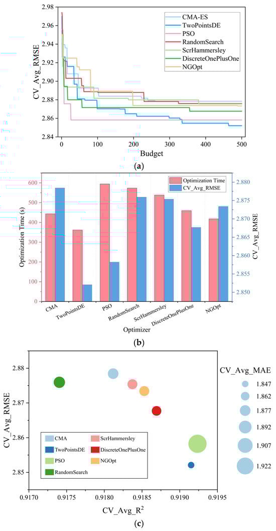The predefined hyperparameter search space is presented in Table 3. Figure 3a presents the variation trend of the objective function value CV_Avg_RMSE with respect to the number of iterations (budget) during the optimization process. Figure 3b shows the best objective values obtained by the seven optimizers, along with their corresponding computational times. Among these optimizers, TwoPointsDE achieves the lowest CV_Avg_RMSE within the 500-iteration budget while requiring the least optimization time. Figure 3c presents a bubble chart that provides an intuitive comparison of the overall performance of the different optimization methods. The horizontal axis represents the cross-validation average R2 (CV_Avg_R2), and the vertical axis corresponds to CV_Avg_RMSE. The bubble size indicates the cross-validation average MAE (CV_Avg_MAE), and different colors distinguish the optimizers used. From Figure 3c, TwoPointsDE achieves lower CV_Avg_RMSE and CV_Avg_MAE values compared to the other optimizers, while its CV_Avg_R2 is second only to PSO, indicating that it exhibits the best overall performance.