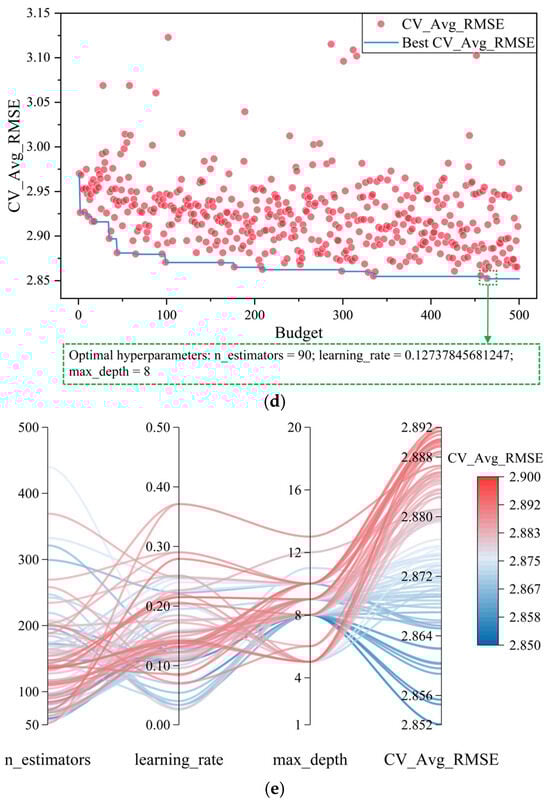 Hyperparameter optimization process of the XGBoost model: (a) variation in the best CV_Avg RMSE, (b) optimization time of optimizers, (c) comprehensive comparison of optimizers’ predictive performance, (d) variation in the objective value during the TwoPointsDE optimization process, and (e) hyperparameter optimization path of TwoPointsDE (top 100 ranked sets).