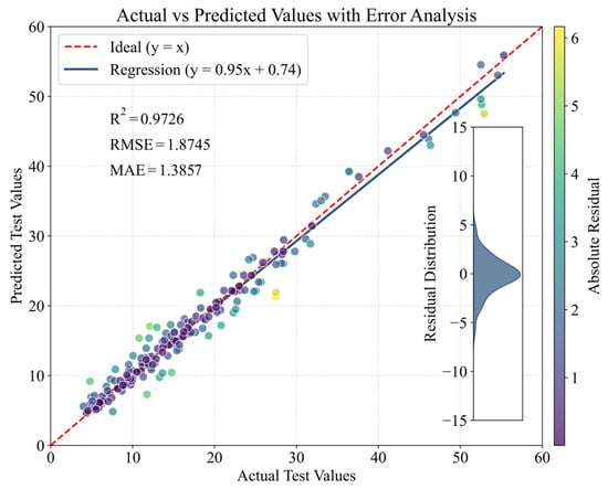 The optimized XGBoost model is used to predict the test dataset, and the results are illustrated in Figure 4. The red dashed line represents the ideal scenario, where the predicted values equal the actual values (y = x), and the blue solid line denotes the regression fit of the model predictions. As shown in the figure, the model achieves an R2 of 0.9726, indicating a strong predictive capability. Furthermore, the RMSE and MAE are 1.8745 and 1.3857, respectively, demonstrating low prediction errors and high accuracies. The residual distribution plot on the right reveals that most residuals are symmetrically distributed around zero, with only a few extreme deviations, suggesting no significant systematic bias in the model predictions. The color bar represents the absolute values of the prediction residuals, where darker colors indicate smaller errors and lighter colors correspond to larger deviations. Overall, the optimized XGBoost model performs well on the test dataset, effectively capturing the actual data trends with high predictive accuracy.