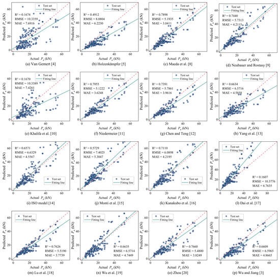 Scatter plot of the prediction results of the existing bond strength models on the test set [,,,,,,,,,,,,,,,].