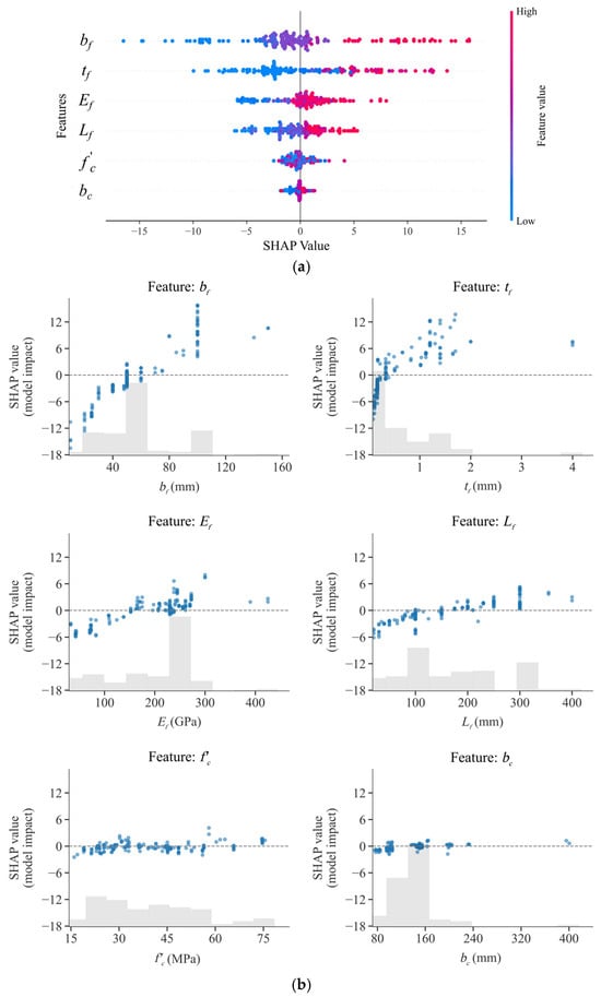 - The SHAP-based interpretability analysis reveals that the contribution of features to the prediction results, from highest to lowest, is as follows: bf, tf, Ef, Lf, fc′, and bc. The feature values of bf, tf, Ef, and Lf show a generally positive correlation with the SHAP values. The global and local interpretation results support the model’s interpretability requirements for engineering applications.