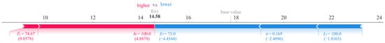 Figure 7 presents the SHAP force plot, which intuitively illustrates the specific contributions of individual input features to the final prediction for a particular sample in the test set. According to Table 6, the feature values of this sample are as follows: bc = 150 mm, fc′ = 74.67 MPa, Ef = 73 GPa, tf = 0.169 mm, bf = 100 mm, and Lf = 100 mm. Based on these feature values, the model’s baseline prediction (i.e., the initial prediction value in the absence of any feature contributions) is 17.7713. For this particular sample, bf exhibits the highest positive contribution to the prediction, with a SHAP value of 4.8879. In contrast, Ef has the highest negative contribution, with a SHAP value of −4.4544. After aggregating the positive and negative contributions of all features, the final predicted value of the model for this sample is 14.5847 kN. The actual bond strength for this sample is 15.14 kN, demonstrating close agreement between the predicted and actual values. This result validates the effectiveness of the model in predicting the bond strength of the FRP-concrete interface.