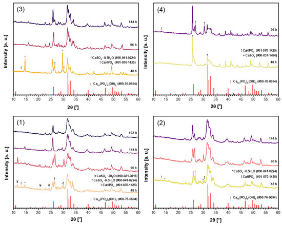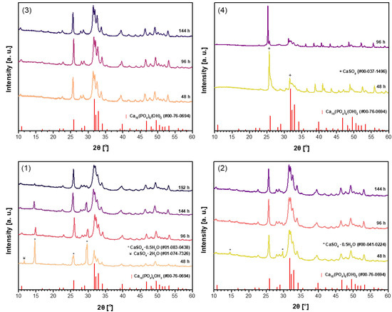 XRD patterns of the CHA samples synthesized from unheated phosphogypsum (1), phosphogypsum dried at 100 °C (2) or 150 °C (3), or phosphogypsum heated at 1000 °C (4) using a mixture of Na2HPO4 + NaH2PO4 + NaHCO3 and different durations in the dissolution–precipitation procedure.