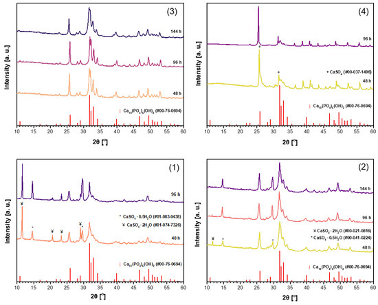 XRD patterns of the CHA samples synthesized from unheated phosphogypsum (1), phosphogypsum dried at 100 °C (2) or 150 °C (3), or phosphogypsum heated at 1000 °C (4) using Na2HPO4 and different durations in the dissolution–precipitation procedure.