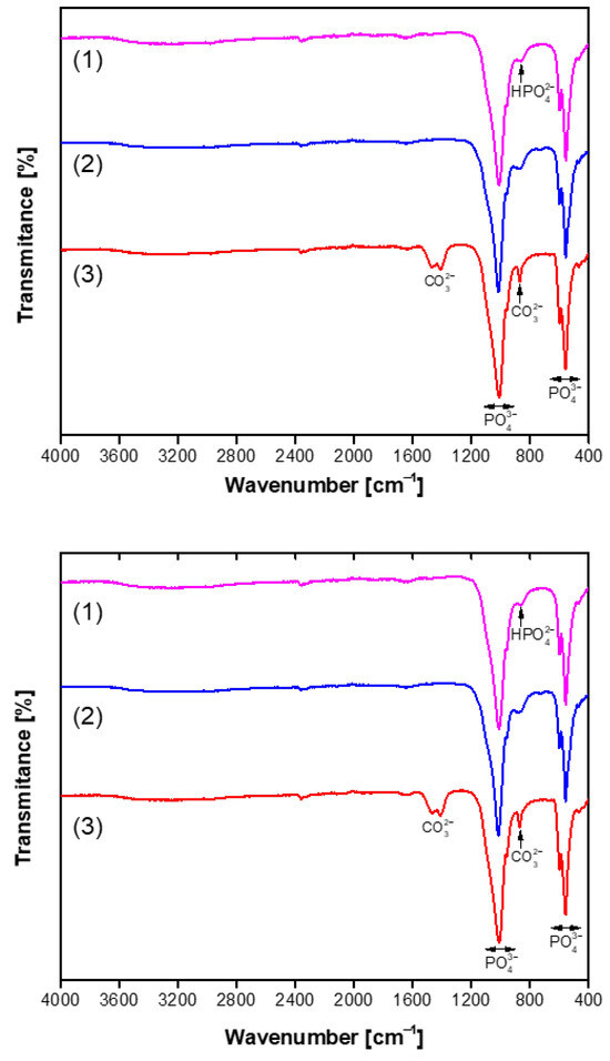 Phosphorus starting materials were selected based on findings reported in the literature. For instance, a mixture of Na2HPO4 and NaH2PO4 has been successfully employed in the synthesis of magnesium whitlockite via the dissolution–precipitation method [59]. Similarly, octacalcium phosphate blocks have been fabricated through a dissolution–precipitation reaction using Na2HPO4 as the phosphorus source [60]. Bone apatite is a form of carbonated calcium hydroxyapatite that typically contains 6–9 mass% carbonate within its apatitic structure [61]. Based on this, a mixture of Na2HPO4, NaH2PO4, and NaHCO3 was also used for the synthesis of calcium hydroxyapatite to better replicate the composition of natural bone apatite.